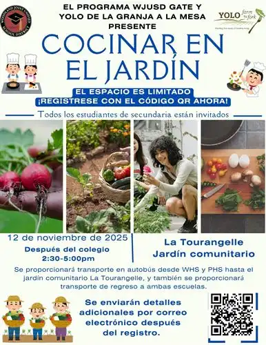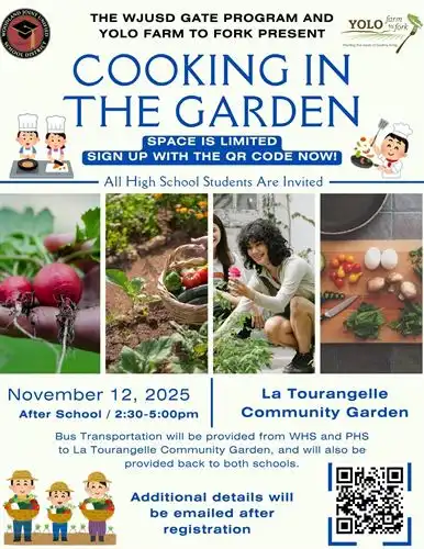 Join us for another fun Fall Field Trip to La Tourangelle. Learn about sustainable agriculture, harvest fresh fruits and vegetables, and cook a farm to fork meal! This is an afterschool field trip for High School Students. Bus transportation will be provided. See the flyer for more details. Sign up with the link or the QR code in the flyer.